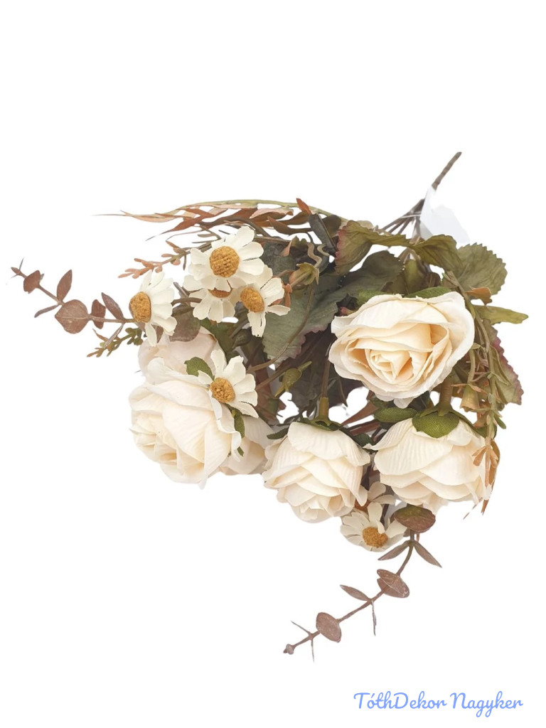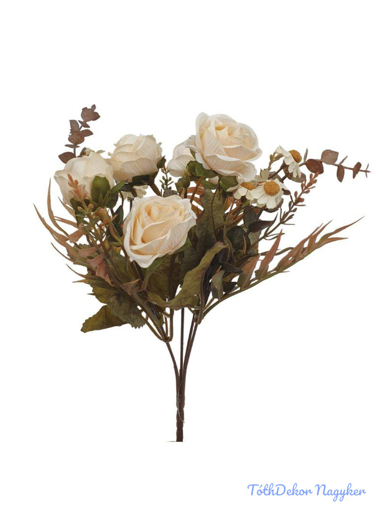 Antik színű rózsa + kis virágos csokor 29cm - Törtfehér