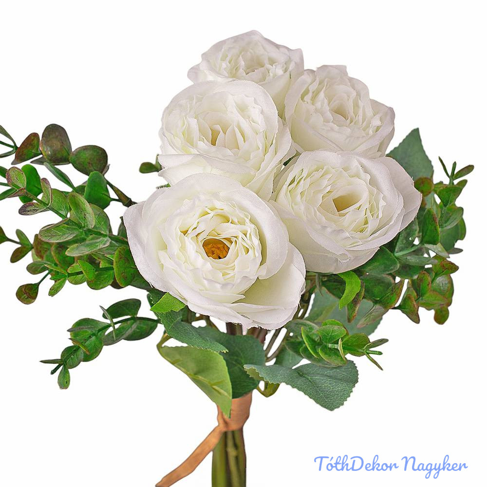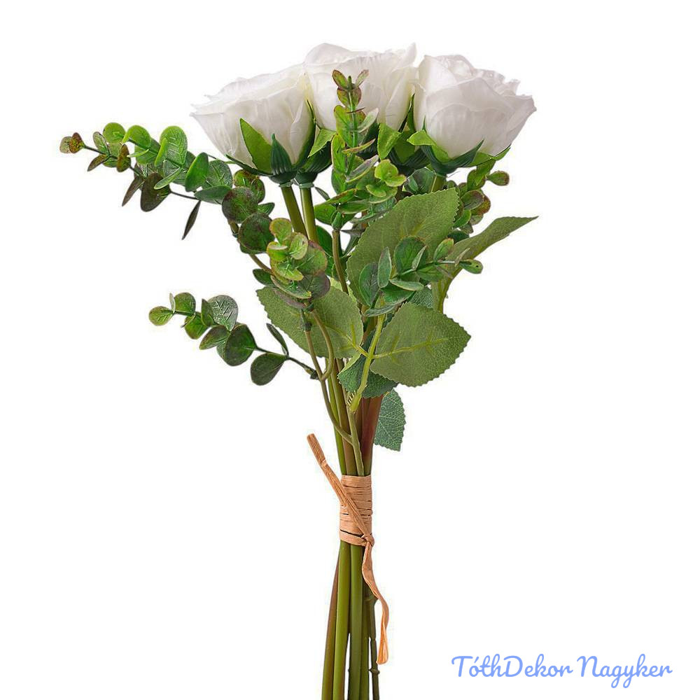 Eukaliptuszos rózsa selyemvirág csokor 36cm - Fehér