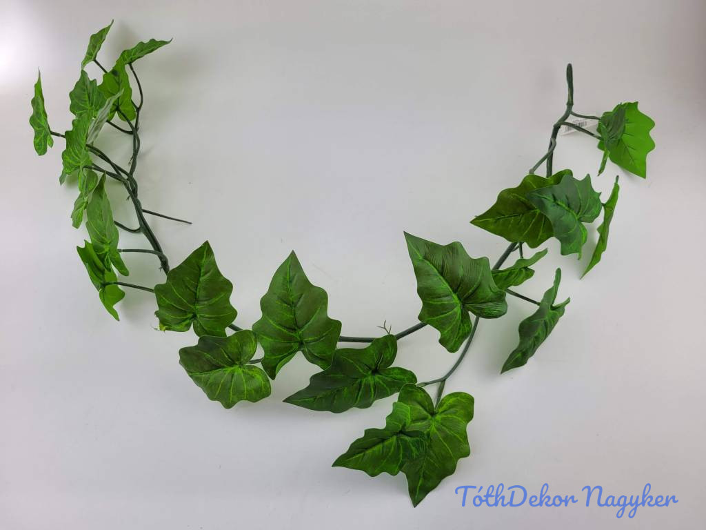 Mű levelű, mosható zöld girland, 120 cm hosszú kivitelben. A girland két kb egyenlő részre tagolható, összedugós rendszerrel van egyben., széthúzással különválasztható.