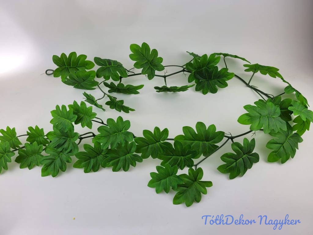 Mű levelű, mosható zöld girland, 180 cm hosszú kivitelben. A girland három kb egyenlő részre tagolható, összedugós rendszerrel van egyben., széthúzással különválasztható.