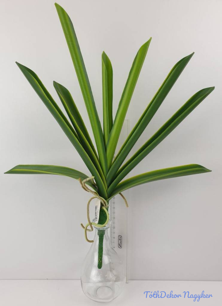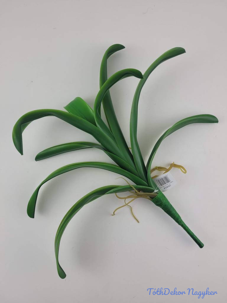 Élethű tapintású gumi orchidea levél, 9 leveles, gumi léggyökérrel. Hajlítható, állítható, drótos alakíthatóság jellemzi a leveleket. 44 cm magas, 35 cm széles.
