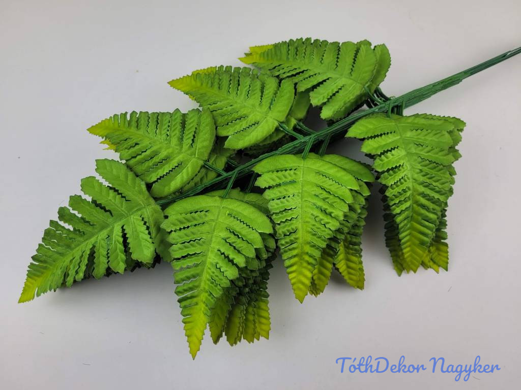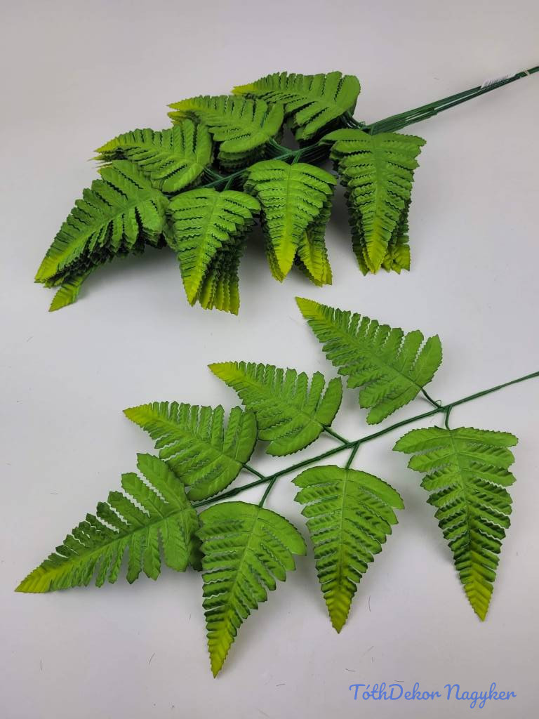 Selyem páfrány leveles együttes 57 cm hosszú ágon. Az ágon 7 db levél van, egy darab mérete kb 13,5x9 cm. Az ár egy darabra értendő, 12 darabosával rendelhető.