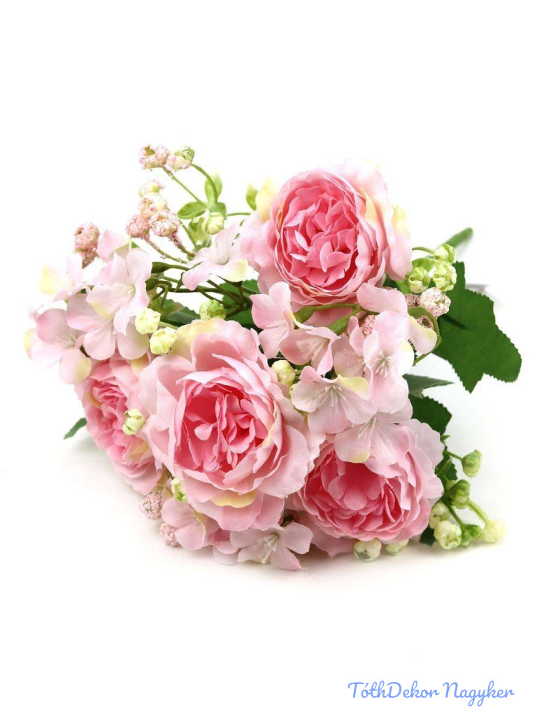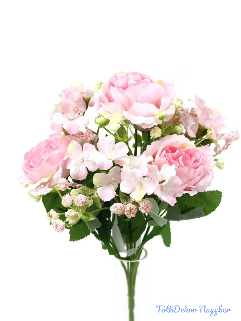 Peónia + kis virág selyem csokor 31cm - Rózsaszín