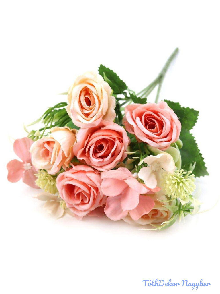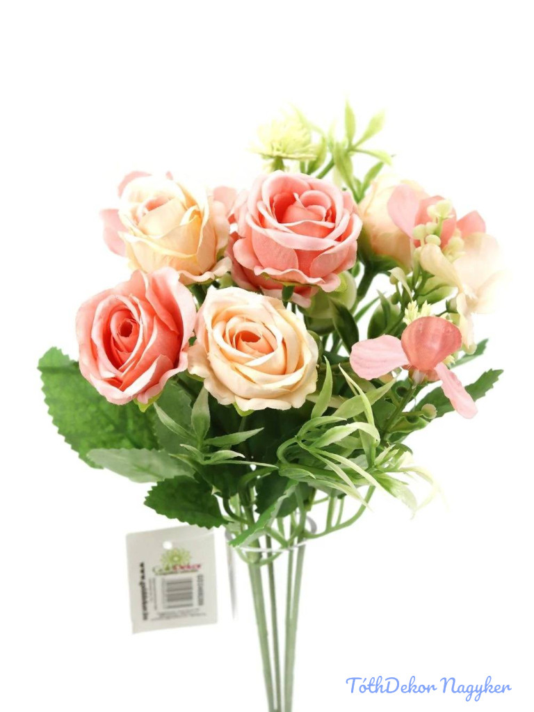 Rózsa 6 fejes kis selyem csokor 27cm - Barack-Rózsaszín