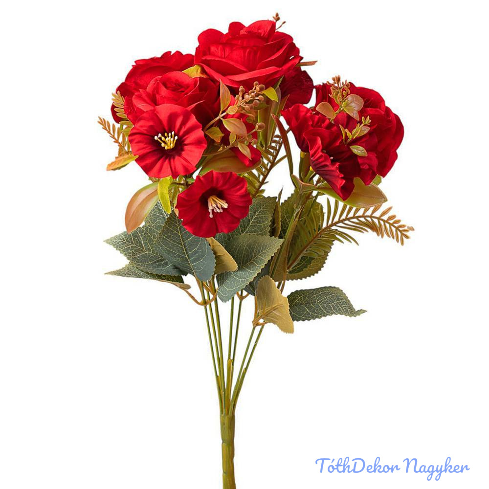 Rózsa 7 ágú selyemvirág csokor 43cm - Piros