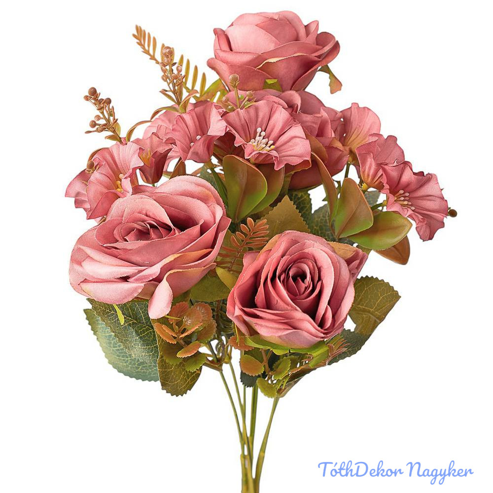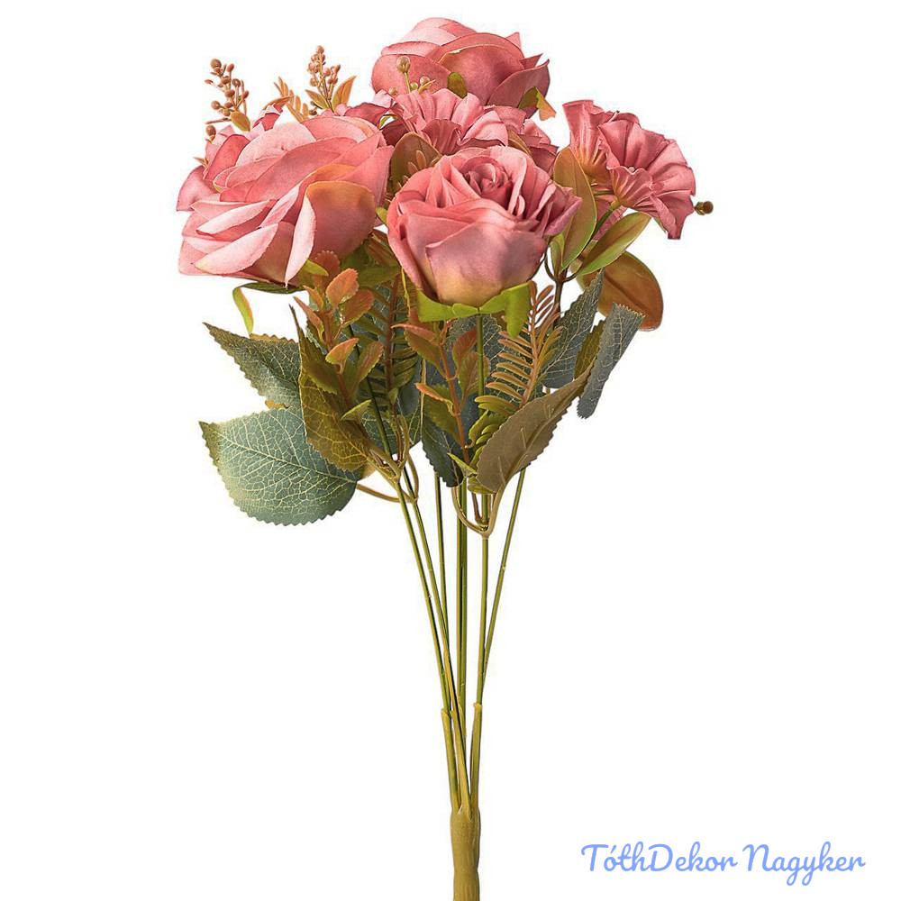 Rózsa 7 ágú selyemvirág csokor 43cm - Rózsaszín