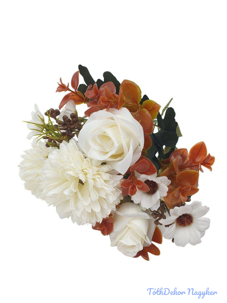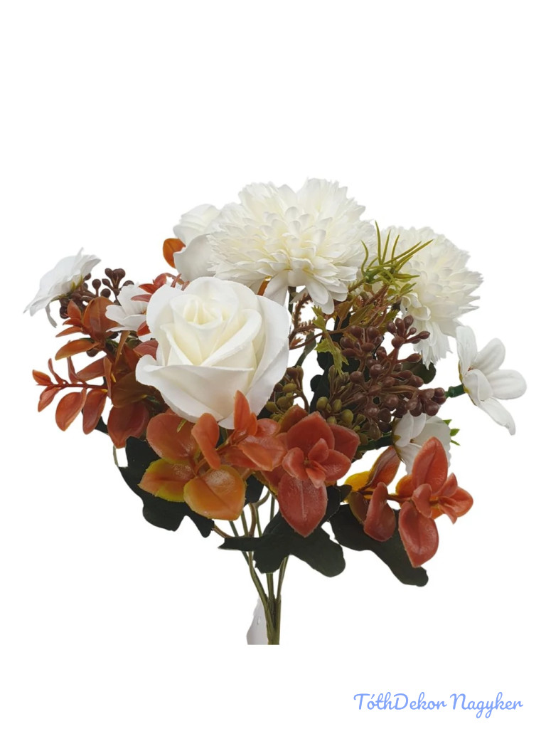 Rózsa-Krizantém vegyes selyemvirág csokor 31cm - Törtfehér