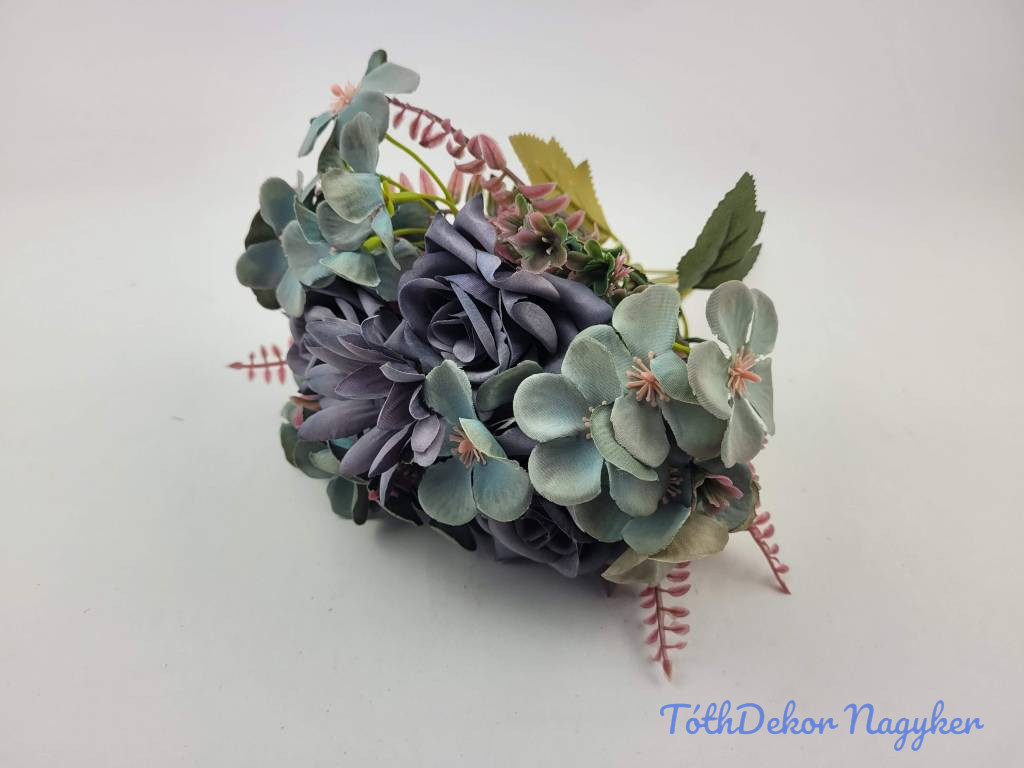 Rózsa + kis virág 7 ágú selyem csokor 29cm - Kék