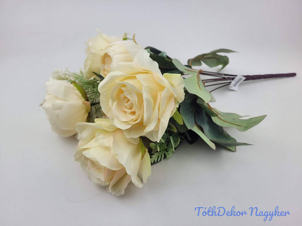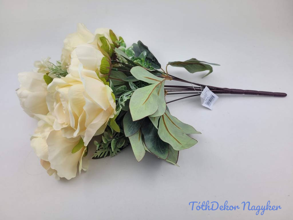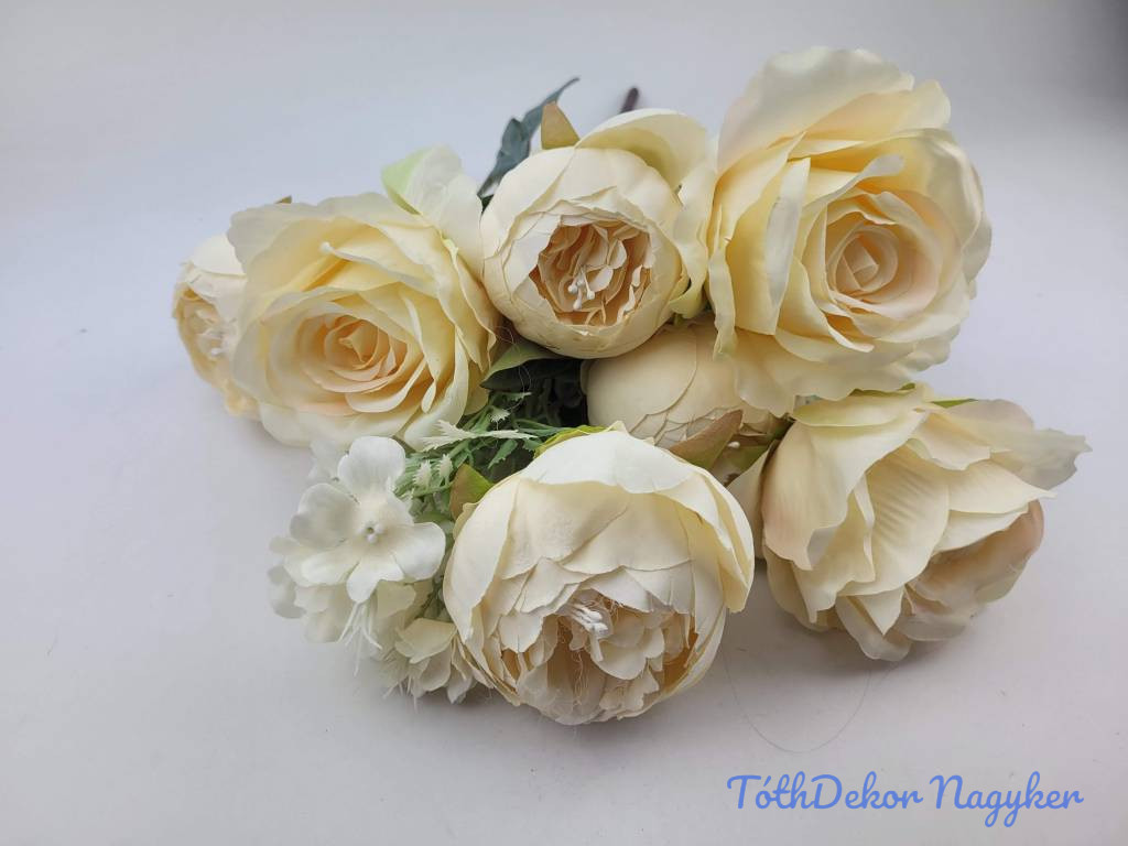 Rózsa-peónia 9 ágú selyemvirág csokor 47cm - Vaj