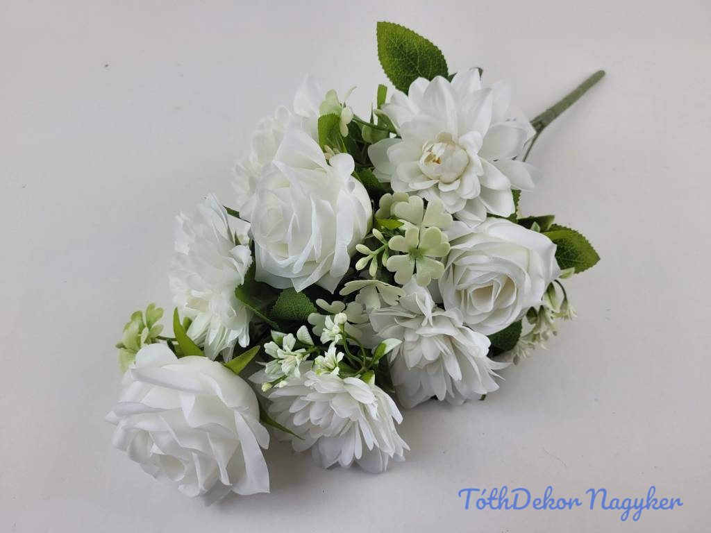 Féloldalas 9 ágú rózsa-dália selyemvirág csokor 50cm - Törtfehér